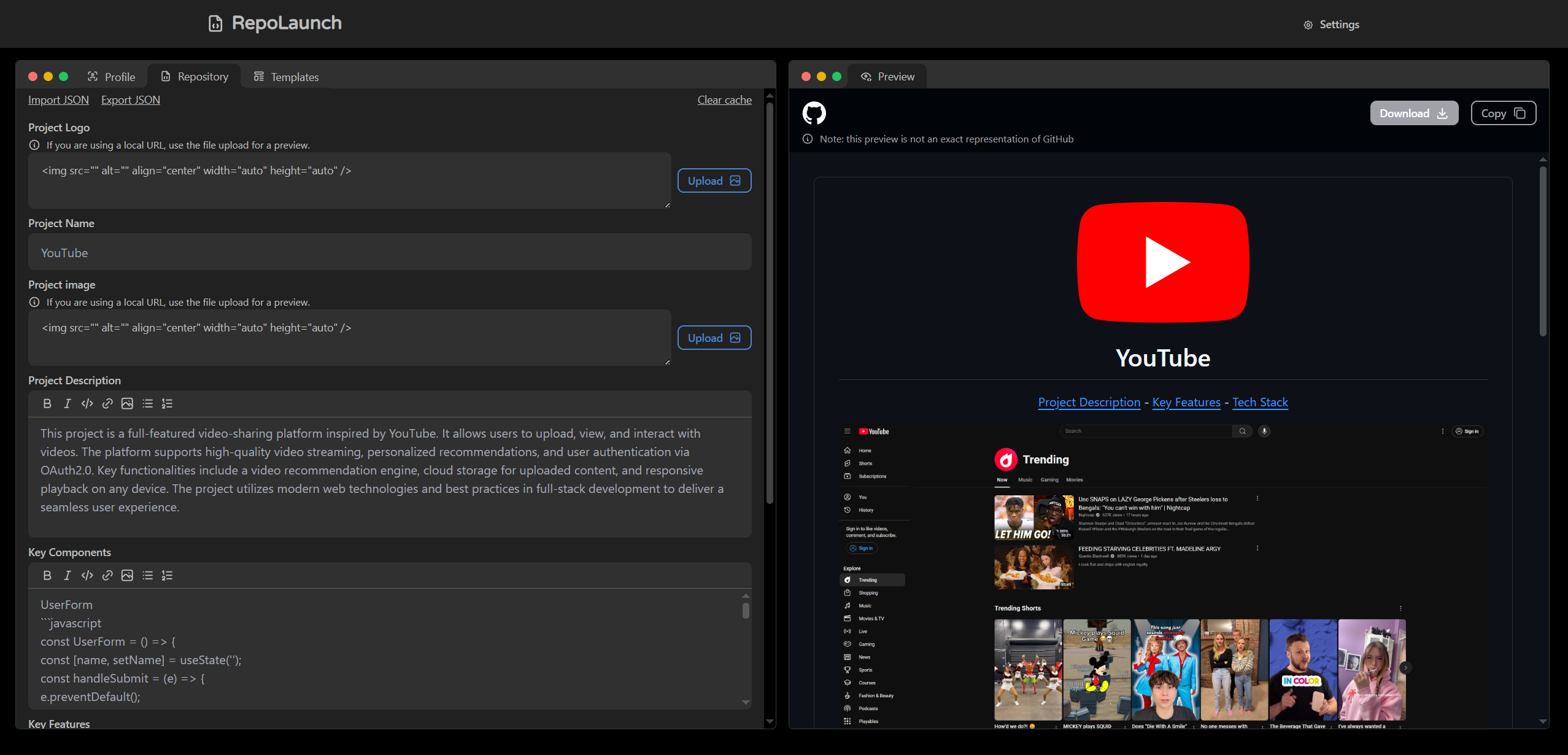 Template based GitHub README.md generator with Markdown/HTML live rendering.
